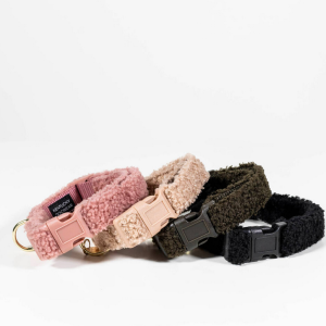 Obroża wykonana z bardzo miękkiej tkaniny przypominającej wełnę na zewnątrz.